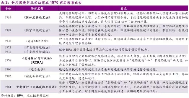 雖然以上法律法規(guī)的頒布和公司所處的固廢行業(yè)并無太大的關聯,但這段時期環(huán)保領域法律法規(guī)的密集出臺,拉開了美國政府正式通過行政干預環(huán)境治理以及扶持環(huán)保產業(yè)崛起的序幕,對固廢行業(yè)的發(fā)展打下了堅實的基礎。