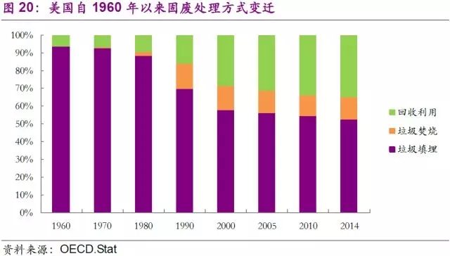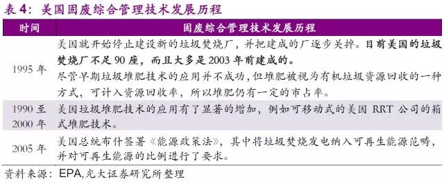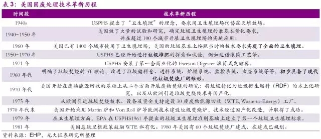 固廢行業(yè)的技術發(fā)展同樣是制約市場和公司發(fā)展的另一個決定性因素。早在1940年,美國公共衛(wèi)生署(USPHS)便開始推行了一系列固廢處置的技術性試驗,從“衛(wèi)生填埋代替露天堆放”,到“垃圾堆肥的探索和試驗”,再到“垃圾焚燒”,最后到了如今大力推廣的“廢物能源回收”的綜合利用。