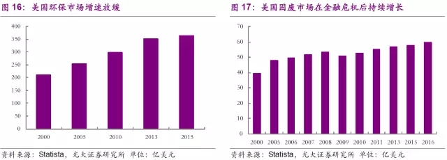 隨著環(huán)保處置設施要求的日益提升,環(huán)保市場也在穩(wěn)步擴大。美國環(huán)保市場從2000年的2090億美元發(fā)展到2015年的3631億美元,但增速近年來有所放緩。固廢市場在2009年受金融危機影響有所下滑后,重回增長軌道。