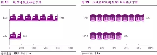 固廢行業(yè)蓬勃發(fā)展也帶來了處置方式的變化。隨著一系列垃圾填埋場污染事件的發(fā)生,美國公眾對于垃圾隨意填埋這種簡單粗暴處置方式的不滿因信息化網絡化的發(fā)達而被無限放大。多方因素導致美國政府逐步關停垃圾填埋場并減少垃圾填埋量。美國的城市固體廢物填埋場從1988年的7924座逐步減少為2012年的1908個,送至垃圾填埋場的垃圾占比也由1989年的89%下降到2014年的52%左右。