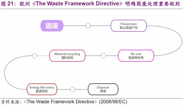 如果分析中國、美國、日本/西歐在固廢行業(yè)的發(fā)展,基本是逐漸完善固廢最大化利用產業(yè)鏈的過程。中國的垃圾填埋和垃圾焚燒技術已經相對成熟,國家在《“十三五”全國城鎮(zhèn)生活垃圾無害化處理設施建設規(guī)劃》中也規(guī)定了2020年城市垃圾無害化處理達到100%的指標要求。但是在處置前端的垃圾分類,以及后端的回收利用,中國距發(fā)達國家仍有較大的差距。美國擁有完善的固廢收運和處理系統(tǒng),但是由于前端垃圾分類的不徹底,導致后端回收利用率受限。日本/西歐則是目前行業(yè)發(fā)展金字塔的頂端。兩個地區(qū)擁有完善的前端垃圾分類和收運轉運體系,垃圾焚燒和循環(huán)再造業(yè)務則是兩個地區(qū)后端處置的不同特色。