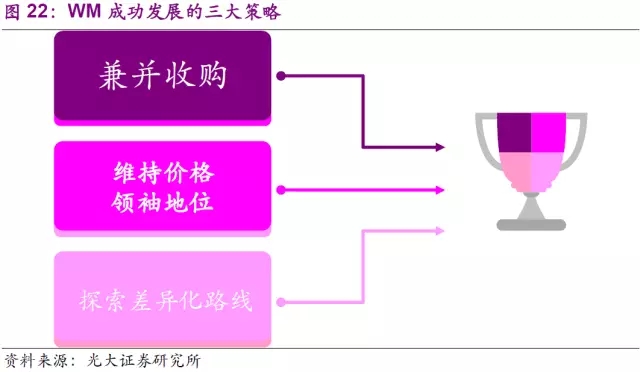 縱觀WM發(fā)展的歷史,它既享受到外部經濟和行業(yè)高速發(fā)展所帶來的廣闊市場,也需經歷經濟危機和市場轉型所帶來的陣痛。公司為搶占市場份額,穩(wěn)固龍頭地位,實現股東最大化方面做出了多方面努力,制定了各類執(zhí)行策略以期達到目標,而我們認為其中最重要的是三項策略,也是我們將進一步細致分析的,即兼并收購,維持價格領袖地位,以及探索差異化路線。