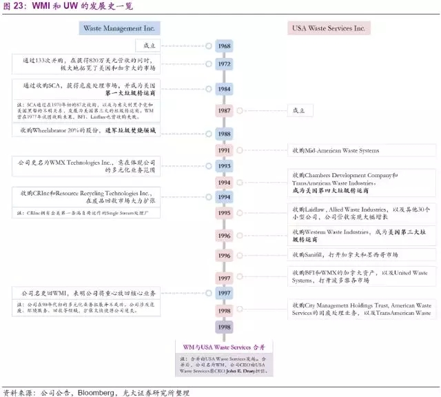 縱觀WM的發(fā)展史,兼并和收購一直貫穿其中。改變公司歷史的一次兼并發(fā)生在1998年,公司與USA Waste Services Inc.(以下簡稱UW)合并,新公司名稱保留為Waste Management。值得注意的是,本次兼并的提出方并不是當時全美第一的固廢龍頭WM提出,而是由當時全美第三的UW提出兼并,同時新公司的CEO也由原UW的CEO擔任。為了更好的分析WM的并購發(fā)展,我們將分別研究WM(合并后),原WM(以下簡稱WMI),以及UW分別的發(fā)展并購史。