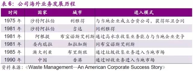 在美國成功擴張的同時,WMI也抓住了在國際市場上發(fā)展的機遇。1975年,公司通過與當地企業(yè)成立合資公司的方式,成功的打開了沙特首都利雅得的環(huán)衛(wèi)市場,這也是世界上第一個跨國的環(huán)衛(wèi)合同。這個合同的示范效應給了WMI世界范圍的關注。1980年,公司先后成功進入了阿根廷、委內瑞拉、澳大利亞、部分歐洲國家,以及香港的危廢及環(huán)衛(wèi)市場,并于1990年成為了世界最大的固廢龍頭。