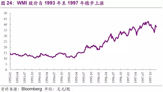 進入90年代,公司不滿足于現有的業(yè)務模式,意圖通過繼續(xù)的并購開拓多元化市場。然而結果卻超出了公司的預想。公司于1993年更名為WMX Technologies,意在體現公司多元化的業(yè)務范圍。通過收購,公司先后進入危廢、石棉移除、金屬腐蝕處理、甚至是草坪養(yǎng)護市場。與之前的垃圾焚燒和垃圾回收不同的是,上述行業(yè)在初期均需要大量資金投入,回報卻極其有限。公司的多領域擴張在一開始收到了回報,股價從1993年初的8.87美元一路上揚至1997年初的18.86美元,漲幅達112%。
