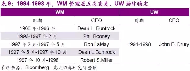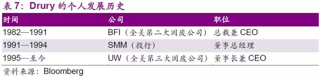 值得一提的是UW高速發(fā)展的源動力,公司CEO John E.Drury。作為Browning-Ferris Industries(以下簡稱“BFI”)的總裁兼COO,Drury用了10年時間引領BFI成為全美第二大固廢公司的位置,然而因為不接受公司CEO大力發(fā)展垃圾回收行業(yè)的決定,離開公司并于1994年擔任UW的CEO。Drury僅花了3年時間,通過1995年的5次大型收購,以及1996年的30次小型收購,將公司的營業(yè)收入從1994年的434萬美元大幅增長至1997年的26億美元,增速高達598倍。