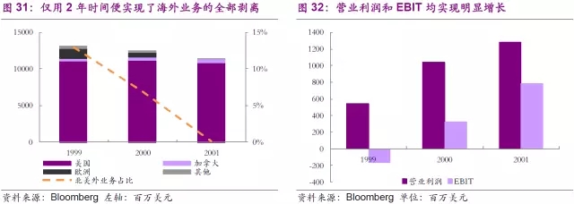 公司在1998年底合并后便堅決的采用了收益導向策略來優(yōu)化公司業(yè)務結構,首當其沖調整的便是海外業(yè)務。北美外業(yè)務是助力公司成為全球最大固廢公司的核心驅動之一,為公司帶來了可觀的營業(yè)收入。但是隨著競爭的逐步加大,北美外業(yè)務的營業(yè)利潤逐步下滑。公司僅用2年時間便基本完成了海外業(yè)務的剝離,這一切還是發(fā)生在美國和加拿大營業(yè)收入同步下滑的基礎上,可見公司的決心。更值得稱道的是,2年間公司營業(yè)利潤實現了明顯增長,股價也隨之走高,充分體現出了收益導向策略的成功之處。