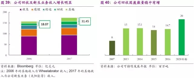 隨著固廢傳統(tǒng)市場業(yè)務趨于飽和,公司也在積極求變。一方面,公司利用自有團隊積極研發(fā)已有業(yè)務的轉型,另一方面,公司先后在2009至2016年,通過多次收購成熟的專業(yè)化新生公司,拓展了醫(yī)廢、有機垃圾、建筑垃圾、電子回收等市場,并取得了一定成績。需要注意的是,公司的以上收購雖涉及不同細分領域,但核心觀念一致,即加大資源回收再利用,這也契合美國固廢市場的轉型,進一步優(yōu)化完善固廢處理全產業(yè)鏈發(fā)展。