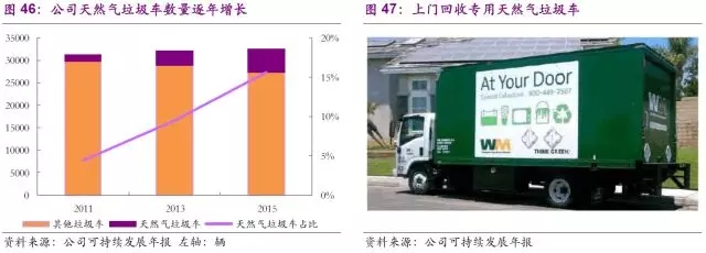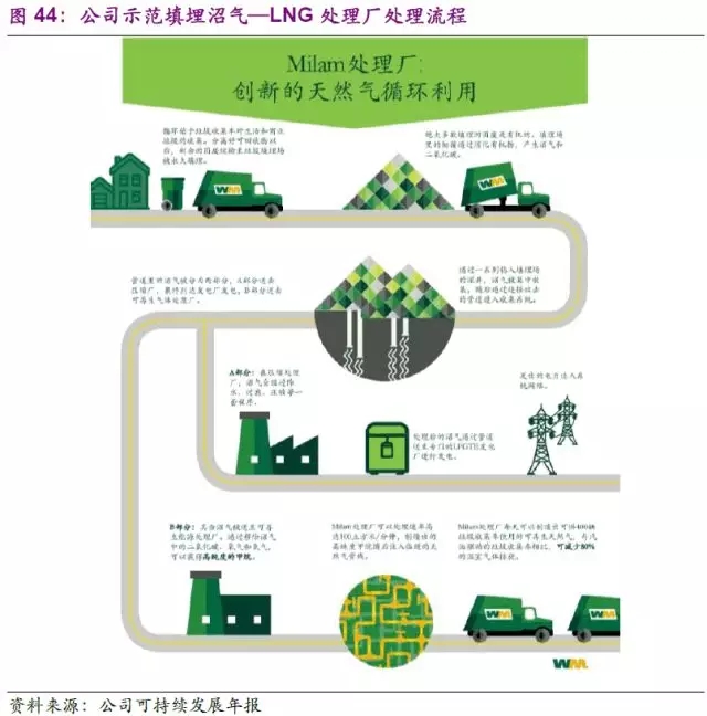 在此基礎上,公司也在領先研究填埋沼氣—天然氣的市場化進程。公司先是于2005年在加州建立了全球最大的填埋沼氣—LNG處理廠,隨后分別于2014和2016年在俄亥俄州和伊利諾伊州建立了兩座填埋沼氣—壓縮天然氣處理廠。上述天然氣的產出在兩方面得到利用:一是用于公司自有的垃圾收集車(40%),二是進入天然氣管網銷售,在降低公司運營成本的同時也提供了一定營收。