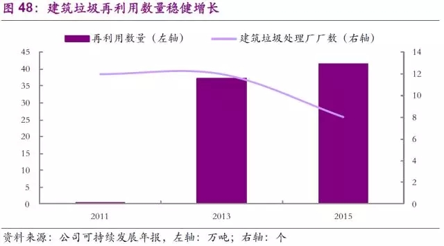 早在2000年初,公司便積極發(fā)展建筑垃圾的回收工作。公司在2009年至2014年間,通過10余家建筑垃圾回收廠占據了穩(wěn)定市場份額,建筑行業(yè)的季節(jié)性高峰特性也為公司在夏季的營業(yè)收入做出了可觀貢獻。而在2011年,公司又創(chuàng)新式的推出了“分散回收跟蹤工具”,通過跟蹤使用在工程中的重復利用建筑材料,幫助工程項目方更好地完成綠色建筑的目標。截止2015年,通過跟蹤工具的幫助,已有多達 41萬噸的建筑垃圾得到回收或再利用,比2013年的37萬噸增長10%。