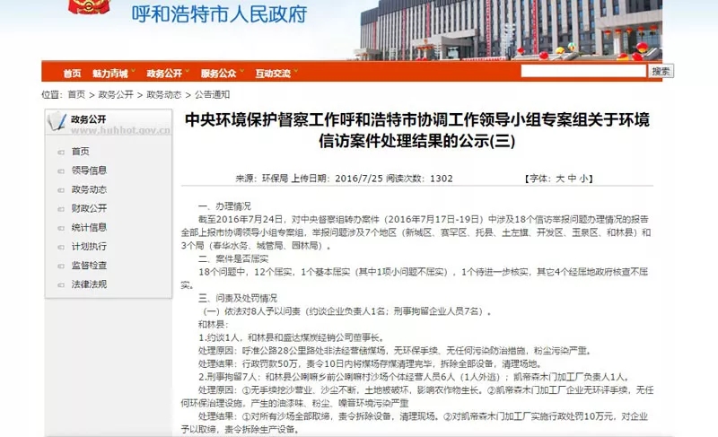 在呼和浩特市人民政府網(wǎng)站的政務(wù)公開一欄中,督察人員查閱到標(biāo)題為《中央環(huán)境保護(hù)督察工作呼和浩特市協(xié)調(diào)工作領(lǐng)導(dǎo)小組專案組關(guān)于環(huán)境信訪案件處理結(jié)果的公示(三)》的網(wǎng)頁,其中清楚地顯示對凱帝森木門加工廠的問責(zé)及處罰情況?!皠P帝森木門加工廠企業(yè)無環(huán)評手續(xù),無任何環(huán)保治理設(shè)施,產(chǎn)生的油漆味、粉塵、噪音環(huán)境污染嚴(yán)重”。處理結(jié)果是“對凱帝森木門加工廠實施行政處罰10萬元,對企業(yè)予以取締,責(zé)令拆除生產(chǎn)設(shè)備”。
