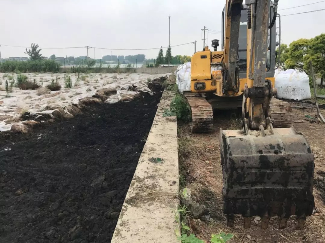 督察人員在南池西側(cè)看到停著一臺小型挖掘機(jī),幾十袋包裝好的污泥擺放在旁邊。泰興市工作人員介紹,正在將少量含水率較低的污泥裝袋,運到危廢儲存場所暫存,最終安全處置。但是從現(xiàn)場情況看,挖掘工作才剛剛開始。