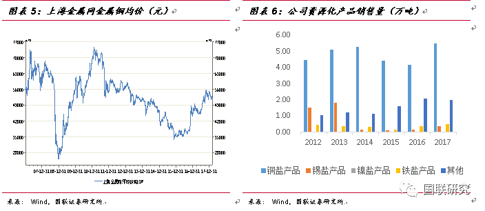 公司工業(yè)廢物資源化利用業(yè)務(wù)亦為公司重要主營(yíng)業(yè)務(wù)之一。由于資源化業(yè)務(wù)不僅受到產(chǎn)能和產(chǎn)品銷量影響,還與大宗商品的價(jià)格波動(dòng)息息相關(guān)。公司資源化產(chǎn)品主要包括銅鹽、錫鹽、鎳鹽和鐵鹽產(chǎn)品等。2016年前,受到國(guó)際基本金屬價(jià)格下跌、行業(yè)競(jìng)爭(zhēng)加劇的影響,公司資源化業(yè)務(wù)營(yíng)收略有下降。2012至2016年,公司資源化業(yè)務(wù)營(yíng)收由9.39億元降低至7.91億元,毛利率維持在30%左右,而2017年,公司資源化業(yè)務(wù)營(yíng)收11.82億,同比增長(zhǎng)49.33%,主要是因?yàn)楦骰刭Y源化產(chǎn)銷量增加、重金屬價(jià)格上升、加之公司加大海外銷售等。