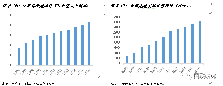 在一系列環(huán)保政策的刺激下,危廢處置行業(yè)需求將逐步迎來有效釋放。根據(jù)《2017年全國(guó)大、中城市固體廢物污染環(huán)境防治年報(bào)》統(tǒng)計(jì)數(shù)據(jù)顯示,截至2016年底,全國(guó)各省(區(qū)、市)頒發(fā)的危廢(包含醫(yī)療廢物)經(jīng)營(yíng)許可證共計(jì)2195份,核準(zhǔn)經(jīng)營(yíng)規(guī)模為6471萬噸/年(含收集經(jīng)營(yíng)規(guī)模397萬噸/年)。而根據(jù)環(huán)境防治年報(bào),2016年實(shí)際經(jīng)營(yíng)規(guī)模為1629萬噸(含收集23萬噸),有效處理能力較低,大量的產(chǎn)能仍未完全釋放。