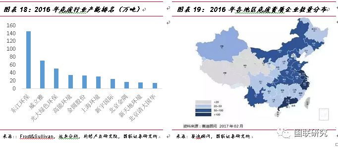 行業(yè)集中度低、規(guī)模小,公司處于絕對(duì)領(lǐng)先地位。我國(guó)的危廢行業(yè)的市場(chǎng)參與者眾多,但是具有規(guī)模效應(yīng)的企業(yè)很少,目前我國(guó)危廢行業(yè)呈現(xiàn)出的特征主要有以下幾點(diǎn):①行業(yè)集中度低:根據(jù)Frost&Sullivan、遠(yuǎn)卓分析、前瞻產(chǎn)業(yè)研究院的統(tǒng)計(jì)數(shù)據(jù),截止 2016 年,行業(yè)內(nèi)排名前十大公司僅占總設(shè)計(jì)處置能力的6.8%,其中東江環(huán)保市占率為2.26%,處絕對(duì)領(lǐng)先地位;②危險(xiǎn)廢物產(chǎn)生量與處理能力分布不匹配。2016年我國(guó)持危險(xiǎn)廢棄物經(jīng)營(yíng)許可證的企業(yè)數(shù)量為2149家,主要集中于長(zhǎng)三角和珠三角區(qū)域,欠發(fā)達(dá)地區(qū)許可證數(shù)量少。其中江蘇、浙江和廣東三省資質(zhì)企業(yè)數(shù)量共計(jì)503家,占全國(guó)總數(shù)的30%以上。根據(jù)Frost&Sullivan的數(shù)據(jù),2015年危險(xiǎn)廢物產(chǎn)生量主要集中在東部、西北部、中部,分別占總產(chǎn)生量的31%、24%,13%,可以看出華東地區(qū)及西北地區(qū)占危險(xiǎn)廢物產(chǎn)生量的大部分。而經(jīng)濟(jì)發(fā)達(dá)地區(qū)如華東及華南占危險(xiǎn)廢物處理能力的大部分。危廢處置行業(yè)中,東江環(huán)保、光大國(guó)際、威立雅中國(guó)、新宇國(guó)際等企業(yè)進(jìn)入行業(yè)較早,經(jīng)過多年的發(fā)展已經(jīng)具備規(guī)模和產(chǎn)能優(yōu)勢(shì),而且位于危廢產(chǎn)生量較大的省份,有較強(qiáng)的客戶資源和競(jìng)爭(zhēng)優(yōu)勢(shì)。③經(jīng)營(yíng)企業(yè)規(guī)模小、處理能力弱。按照2016年核準(zhǔn)經(jīng)營(yíng)規(guī)模和企業(yè)數(shù)量的數(shù)據(jù)測(cè)算,平均每家的核準(zhǔn)處理能力僅為3萬噸/年,并且大部分企業(yè)技術(shù)、資金等實(shí)力較弱,日均處理能力超過50噸的企業(yè)占比不到20%,達(dá)到1000噸的僅占0.3%,并且能夠處理25種以上危廢種類的企業(yè)僅為1%,絕大多數(shù)均小于10種。在2017年,東江環(huán)保已具備44類危險(xiǎn)廢物經(jīng)營(yíng)資質(zhì),在危廢行業(yè)中處于絕對(duì)領(lǐng)先地位。