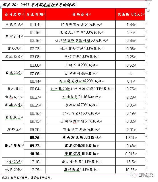 行業(yè)并購熱度高,進(jìn)入群雄逐鹿時(shí)代。在過去的2017年,我國(guó)危廢行業(yè)兼并購市場(chǎng)火爆,整個(gè)環(huán)保產(chǎn)業(yè)共發(fā)生86起并購,交易金額達(dá)385億元,交易金額與數(shù)量均創(chuàng)新高,其中涉及到危廢的并購市場(chǎng)達(dá)20余起。