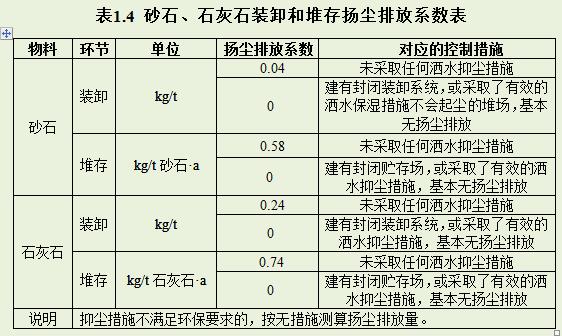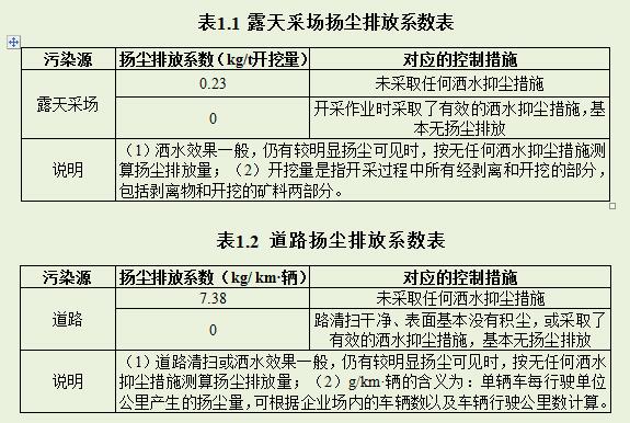 在粉塵無組織排放量計(jì)算時(shí),應(yīng)優(yōu)先采用公式法,所用公式參考《揚(yáng)塵源顆粒物排放清單編制技術(shù)指南》(環(huán)境保護(hù)部公告2014年第92號);在公式法計(jì)算所需參數(shù)無法獲取時(shí),可采用排污系數(shù)法,具體的排放系數(shù)見表1.1~表1.6。