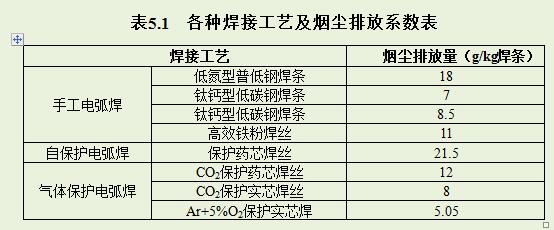 金屬家具焊接廢氣中主要污染物為煙塵。無除塵設(shè)施的,對應(yīng)于各種焊接工藝的煙塵排放系數(shù)見表5.1。有除塵設(shè)施的,焊接煙塵排放量應(yīng)采用實(shí)測監(jiān)測數(shù)據(jù)測算。