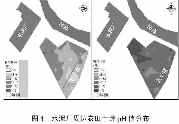 統(tǒng)計(jì)分析結(jié)果表明,上層土壤(0~20cm)pH 值在5.3~7.7 之間波動(dòng),均值為6.50,下層土壤(20~40 cm)pH 值在6.14~7.65 之間波動(dòng),均值為6.81。整體情況看,上層土壤pH 值整體低于下層,表層土壤變幅在1~2 個(gè)單位,下層土壤降幅為0.3 個(gè)單位左右??臻g變異結(jié)果表明(見圖1),水泥廠附近的農(nóng)田土壤pH 值整體在7 左右,距離水泥廠越遠(yuǎn)農(nóng)田土壤pH 值越低,但該區(qū)域靠近公路,公路對該區(qū)域農(nóng)田土壤pH 值降低影響較大,而且隨著影響時(shí)間的延長,底層土壤也受到了影響。