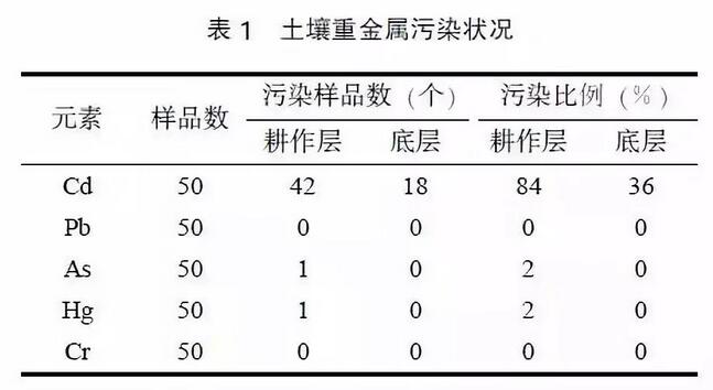 為研究污染場地對周邊農(nóng)田土壤重金屬的影響程度,選取國家GB 15618-1995 《土壤環(huán)境質(zhì)量標(biāo)準(zhǔn)》中的2 級標(biāo)準(zhǔn)作為閾值。采用單因子指數(shù)法對水泥廠周邊農(nóng)田表層土壤總體環(huán)境質(zhì)量現(xiàn)狀進(jìn)行評價(jià),結(jié)果如表1 所示。水泥廠周邊農(nóng)田土壤Pb和Cr 沒有呈現(xiàn)污染特征,但土壤As 和Hg 已呈輕度污染,分別有1 個(gè)樣點(diǎn)質(zhì)量分?jǐn)?shù)超標(biāo),超標(biāo)率為2%;而土壤Cd的污染已較為嚴(yán)重,超標(biāo)樣點(diǎn)數(shù)達(dá)42 個(gè),超標(biāo)率高達(dá)84%。同時(shí)又采用內(nèi)梅羅污染指數(shù)法進(jìn)行綜合評價(jià),以綜合指數(shù)大于1 為臨界值。結(jié)果表明,石灰廠周邊農(nóng)田耕作層土壤共有33 個(gè)樣點(diǎn)超標(biāo),超標(biāo)率達(dá)66%,最大值達(dá)到1.90;底層土壤共有6 個(gè)樣點(diǎn)超標(biāo),超標(biāo)率達(dá)12%,最大值達(dá)到1.72。根據(jù)《農(nóng)田土壤環(huán)境質(zhì)量監(jiān)測技術(shù)規(guī)范》土壤污染分級標(biāo)準(zhǔn),該區(qū)域?yàn)檩p度污染等級。