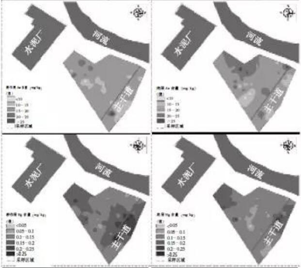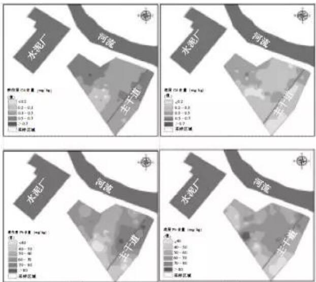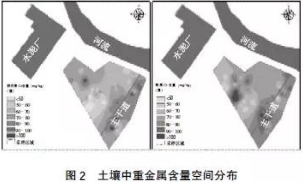 插值結(jié)果表明,該區(qū)域農(nóng)田土壤重金屬含量以水泥廠和公路為中心呈輻射狀分布。地統(tǒng)計(jì)學(xué)研究方法可以對區(qū)域土壤污染源的識別加以指導(dǎo)和檢驗(yàn)。由于污染場地周邊農(nóng)田土壤重金屬含量的超標(biāo)與周邊污染源的影響密切相關(guān),因此要密切關(guān)注污染源對周邊農(nóng)田土壤重金屬的污染問題。