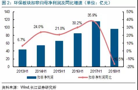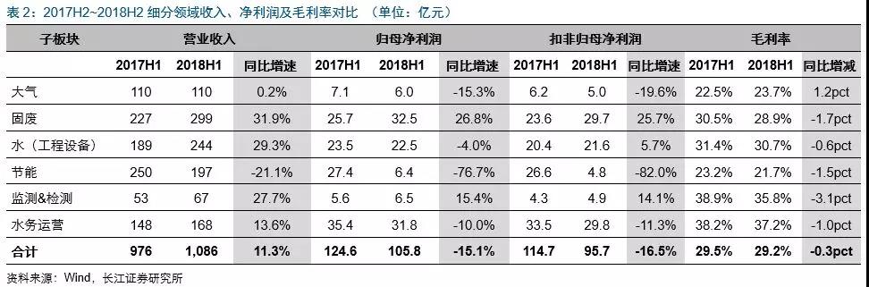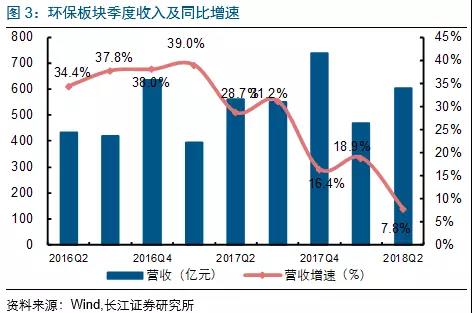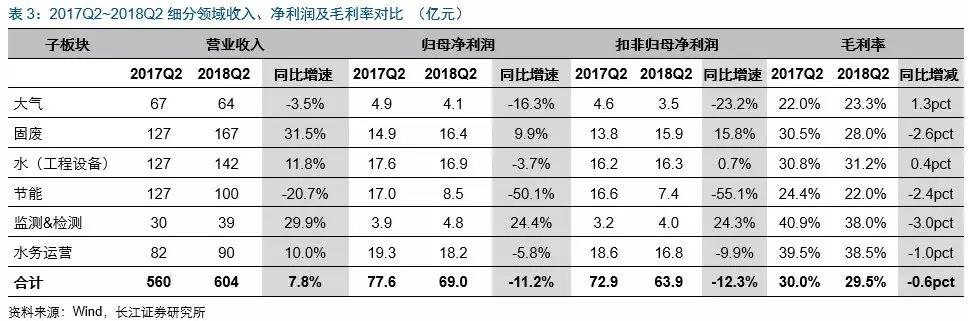 2018Q2環(huán)保板塊營收604億元,同比增7.8%;歸母凈利潤69億元,同比減11.2%;扣非歸母凈利63.9億元,同比降12.3%;毛利率同比降0.6pct至29.5%。營收增速排序分別為固廢(31.5%)、檢測&監(jiān)測(29.9%)、水(工程設(shè)備)(11.8%)、水務(wù)運(yùn)營(10%)、大氣(-3.5%)及節(jié)能(-20.7%);扣非歸母凈利增速排序?yàn)楸O(jiān)測&檢測(24.3%)、固廢(15.8%)、水(工程設(shè)備)(0.7%)、水務(wù)運(yùn)營(-9.9%)、大氣(-23.2%)及節(jié)能(-55.1%)。