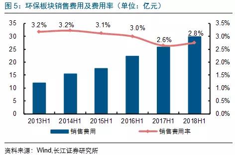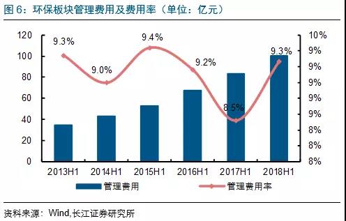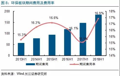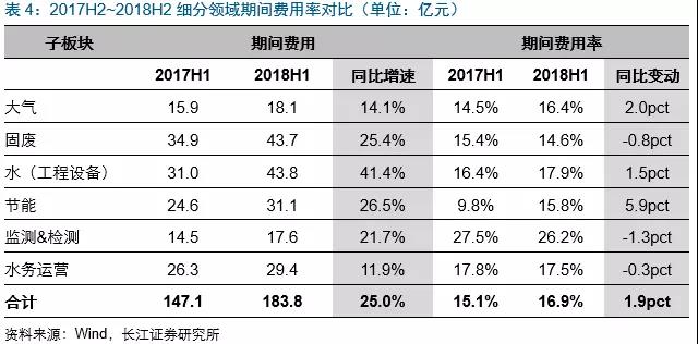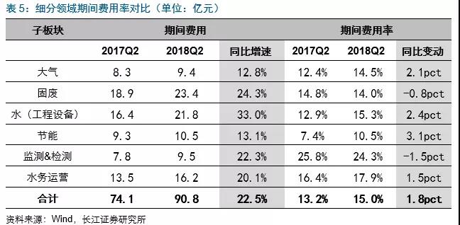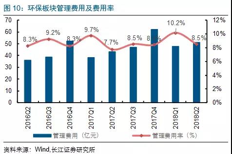 2018H1各板塊期間費(fèi)用增速排序分別為:水(工程設(shè)備)(43.8億,同比增41.4%)、節(jié)能(31.1億,同比增26.5%)、固廢(43.7億,同比增25.4%)、監(jiān)測&檢測(17.6億,同比增21.7%)、大氣(18.1億,同比增14.1%)及水務(wù)運(yùn)營(29.4億,同比增11.9%)板塊。