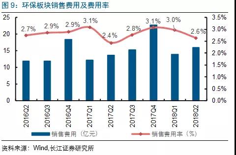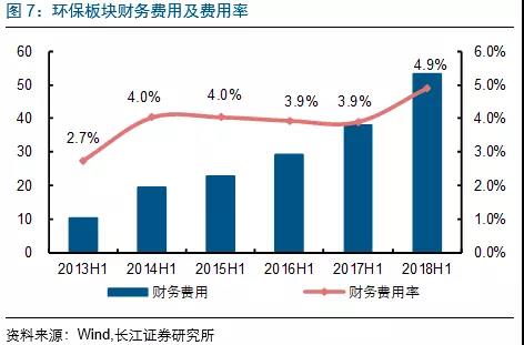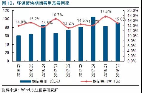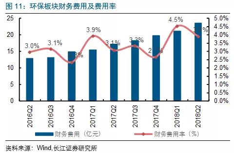 2018Q2環(huán)保板塊期間費(fèi)用累計(jì)支出約90.8億元,同比增22.5%;其中,大氣(9.4億元,同比增12.8%)、固廢(23.4億元,同比增24.3%)、水(工程設(shè)備)(21.8億元,同比增33%)、節(jié)能(10.5億元,同比增13.1%)、監(jiān)測&檢測(9.5億元,同比增22.3%)及水務(wù)運(yùn)營板塊(16.2億元,同比增20.1%);期間費(fèi)用率提升1.8pct至15%。其中銷售費(fèi)用率2.6%,同比增0.2pct;管理費(fèi)用率8.5%,同比增0.5pct;財(cái)務(wù)費(fèi)用率3.9%,同比增0.8pct。財(cái)務(wù)費(fèi)用率繼續(xù)呈現(xiàn)單季度上升趨勢,與當(dāng)下融資成本大幅度上升有關(guān)。