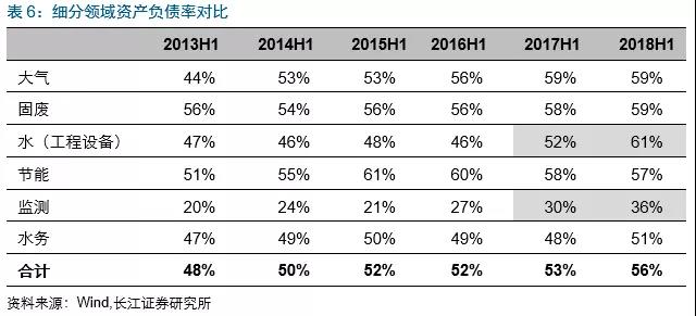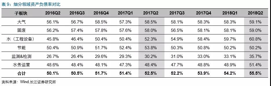 2018Q2水(工程設(shè)備)及監(jiān)測&檢測板塊資產(chǎn)負(fù)債率同比提升較快,分別提升8.5pct、5.5pct至60.8%、35.7%。
