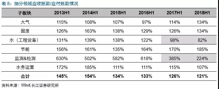 2018H1水(工程設(shè)備)、監(jiān)測&檢測板塊企業(yè)總體對上游資金的占用能力增強(qiáng),應(yīng)收賬款/應(yīng)付賬款主要源于碧水源(由137%降至125%)、國禎環(huán)保(由78%降至71.8%)、博世科(由156%降至119%)改善明顯;監(jiān)測&檢測行業(yè)一直處于改善周期。