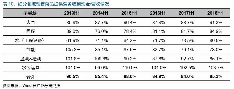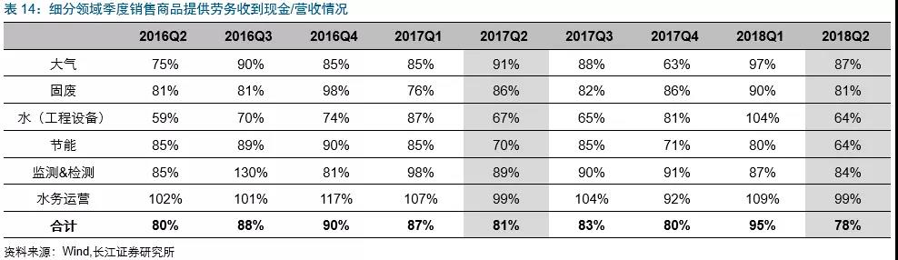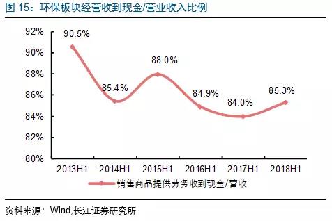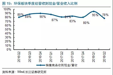 2018Q2環(huán)保板塊銷售商品收到現(xiàn)金/營收(收現(xiàn)比)比率為78%,同比降3pct,各板塊除了水務(wù)其他收現(xiàn)比同比均出現(xiàn)回調(diào)。