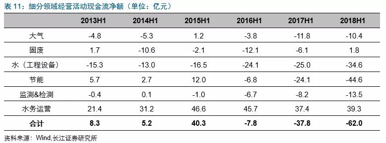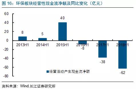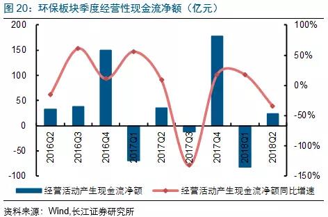 環(huán)保板塊中,僅有水務(wù)運(yùn)營板塊現(xiàn)金流相對可觀,其他板塊現(xiàn)金流均較差;但環(huán)比2018Q1均有多改善。