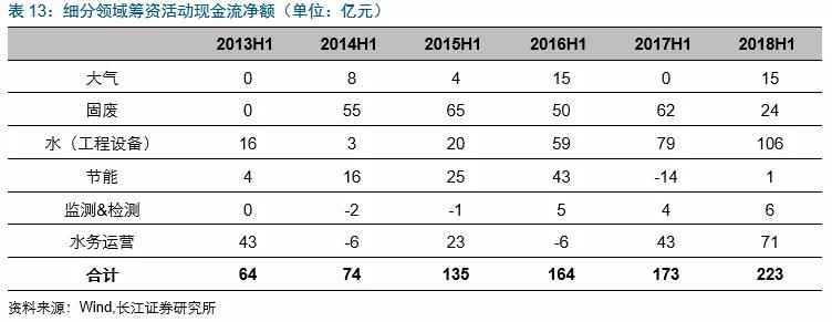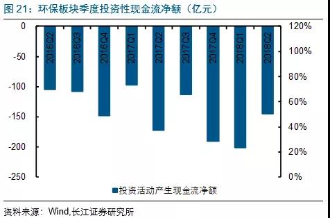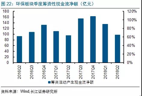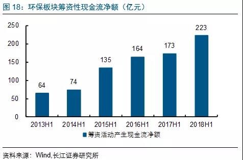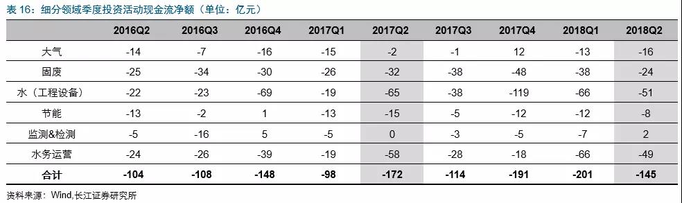 2018Q2大氣板塊因龍凈環(huán)保購買華泰保險(xiǎn)4.9%股權(quán)支付17.6億(Q2支付14個多億)的影響投資活動現(xiàn)金流凈額略有下滑(絕對值變大),固廢&水(工程設(shè)備)等偏PPP類板塊投資活動現(xiàn)金流凈額均有所收縮(絕對值減小)。