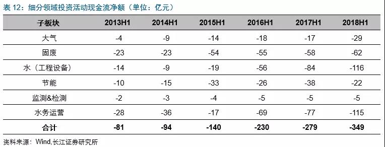 2018H1水(工程設(shè)備)板塊投資活動產(chǎn)生現(xiàn)金流凈額下滑較多,主要受到東方園林投資活動現(xiàn)金流凈額增加較多(由-8億到-27億)的影響;大氣投資活動現(xiàn)金流凈額增加較多主要受龍凈環(huán)保購買華泰保險(xiǎn)4.9%股權(quán)支出約17.6億(目前已支付14個多億)的影響。