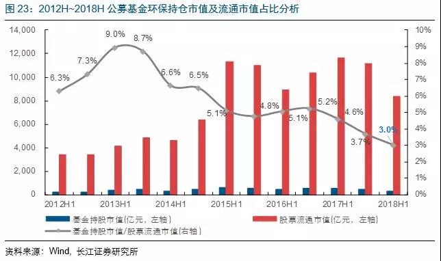 從環(huán)保公司的公募基金歷史持倉數(shù)據(jù)來看,2018H1基金持股總市值約為252億元,占公司總流通市值的3.0%,處于歷史底部。