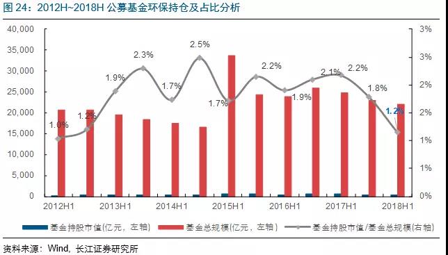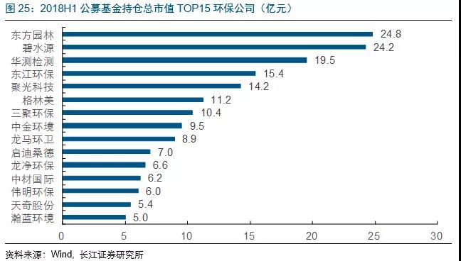 2018H1公募基金配置較多的股票有東方園林(24.8億元)、碧水源(24.2億元)、華測檢測(19.5億元)、東江環(huán)保(15.4億元)、聚光科技(14.2億元)、格林美(11.2億元)、三聚環(huán)保(10.4億元)等公司;機(jī)構(gòu)持倉集中在龍頭企業(yè)。