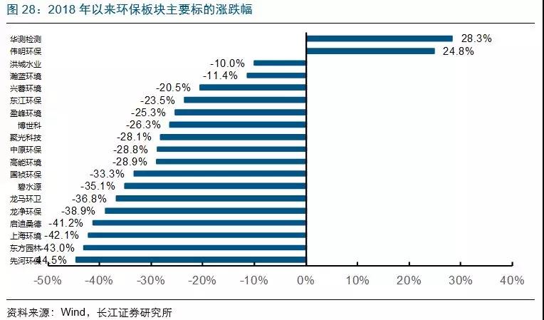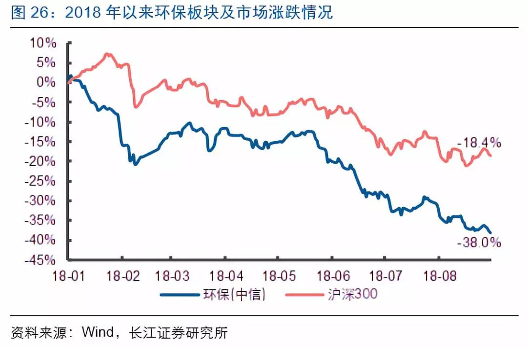 2018年初以來中信環(huán)保指數(shù)下跌38%,同期滬深300指數(shù)下跌18.4%,板塊跑輸指數(shù)19.6pct,該時段內(nèi)的華測檢測(+28.3%)、偉明環(huán)保(+24.8%)等公司漲幅位居前列。