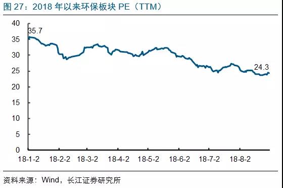 目前環(huán)保板塊PE(TTM)已從2018年初的35.7x降至當(dāng)前的24.3x,多數(shù)標(biāo)的處于歷史估值低位;但目前部分板塊出現(xiàn)業(yè)績增速放緩甚至負(fù)增長的情況,低PE安全邊際有待觀察。