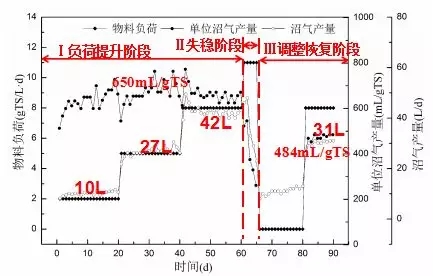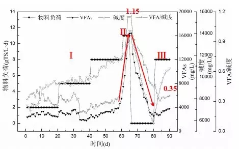 對(duì)于反應(yīng)器運(yùn)行過(guò)程中堿度和有機(jī)酸濃度的變化,VFA/堿度基本在0.4以內(nèi),表明反應(yīng)器運(yùn)行較為穩(wěn)定,VFAs、堿度和VFA/堿度均急劇上升。