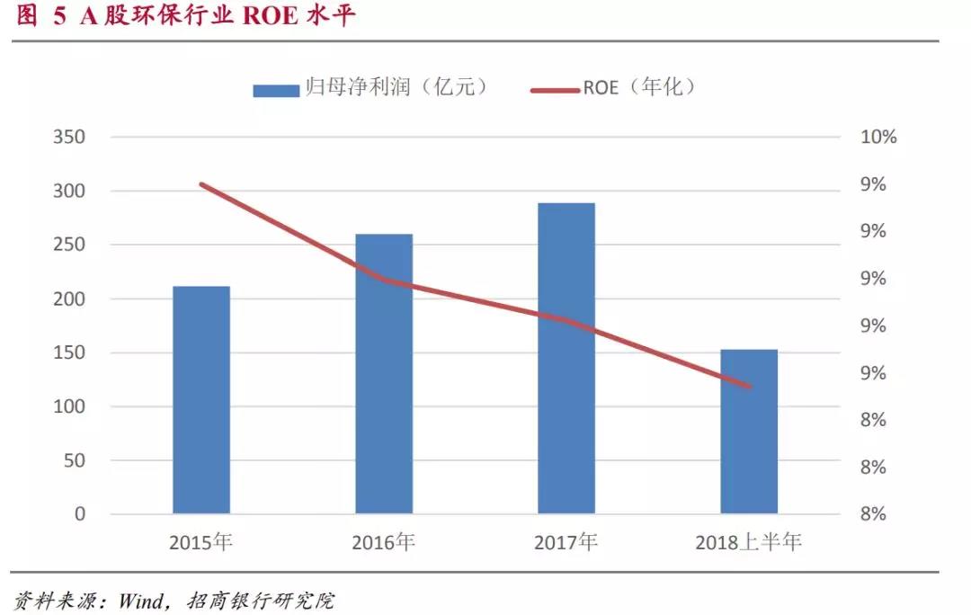 2015年到2017年環(huán)保類上市公司的ROE分別為9.4%、9.0%和8.3%,有逐年下降的趨勢(由于環(huán)保工程類項目大多數結算集中于下半年,2018年上半年年化以后的ROE水平明顯略低屬于正常情況)。在后文的分析中可以看出行業(yè)ROE水平的下降主要是受到運營和制造環(huán)節(jié)ROE下滑的影響。2018年上半年這兩個領域的ROE水平已經開始回升,因此整體行業(yè)ROE下滑的趨勢可能會改變。