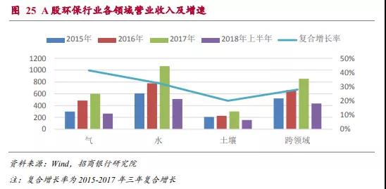 過去三年里,大氣環(huán)保和水體環(huán)保是增速較高的兩個領域,收入的年復合增速分別達到了41.44%和32.47%。這也與這兩年環(huán)保領域重點擴張的領域保持一致。而土壤環(huán)保和跨領域上市公司的收入增長幅度分別低于20%和30%。