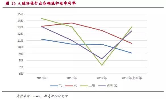 在各領域的資產中,水體環(huán)保的資產在A股環(huán)保行業(yè)資產中占比最高,2018年上半年占到了41.44%。同時這一領域增速也是最快的,達到26.76%。由于水體環(huán)保在未來的3-5年內還將是我國環(huán)保治理的重點領域。我們預計這種趨勢還將持續(xù)一段時間。另外,隨著非電工業(yè)“超低排放”標準的推行,未來大氣環(huán)保在全領域中的資產占比或也將有所提升。