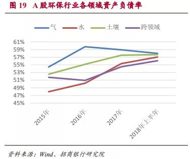 圖18顯示過去的3年里,在A股環(huán)保行業(yè)的各領域中,水體環(huán)保的負債上升速度最快,增速達到了30%以上。同時水體環(huán)保也因此從資產負債率最低的領域快速上升至與平均水平接近。目前4個領域的資產負債率有趨于一致的趨勢,都略低于60%。