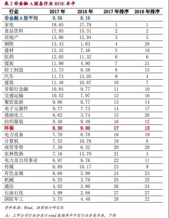 與A股其他行業(yè)相比較來看,環(huán)保行業(yè)ROE處于中游水平。2016年環(huán)保行業(yè)ROE為9.0%,處于28個行業(yè)中的第13位,明顯高于非金融A股的平均水平。而2017年環(huán)保行業(yè)ROE有所下滑,而周期行業(yè)的利潤出現了明顯的回升,使環(huán)保行業(yè)的ROE水平明顯低于非金融類A股的平均投資回報率,排序也下降到第17位。
