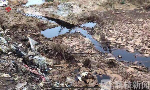 除了沒有及時(shí)填埋的垃圾,在垃圾山四周還有多道小水溝,里面流淌著黑褐色的垃圾滲濾液,這些滲濾液最終匯聚到兩個(gè)大的池塘里,散發(fā)著刺鼻的臭味。