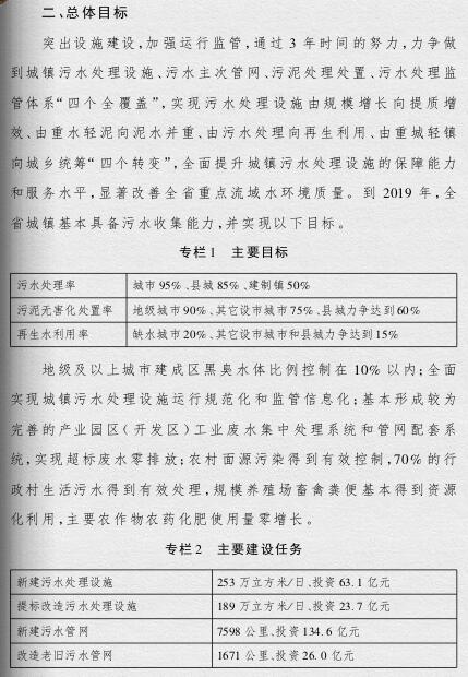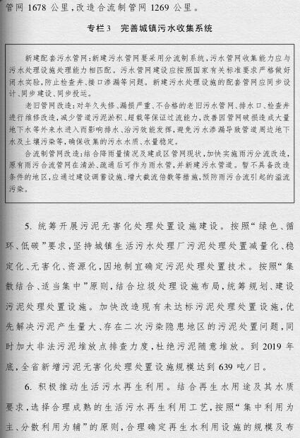 到2019年,全省城市和重點鎮(zhèn)實現(xiàn)污水處理設施建設全覆蓋,城鎮(zhèn)生活污水處理廠提標改造基本完成,新增城鎮(zhèn)生活污水管網(wǎng)7598公里,改造老舊污水管網(wǎng)1678公里、合流制管網(wǎng)1269公里,新增污泥無害化處理處置設施規(guī)模達639噸/日,新增再生水利用設施規(guī)模達89萬立方米/日。