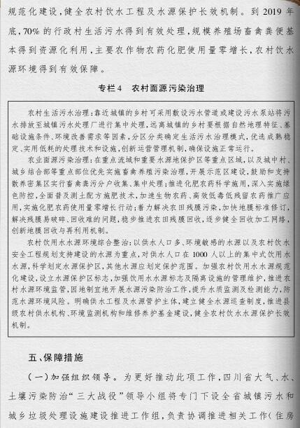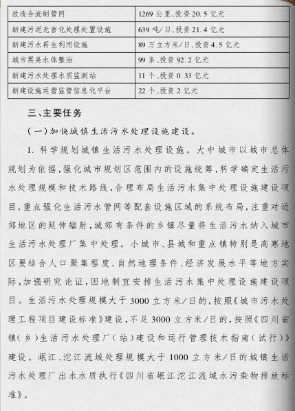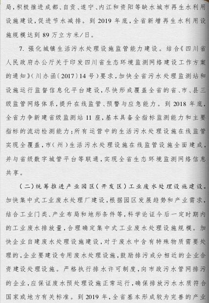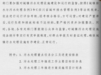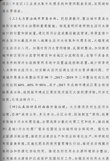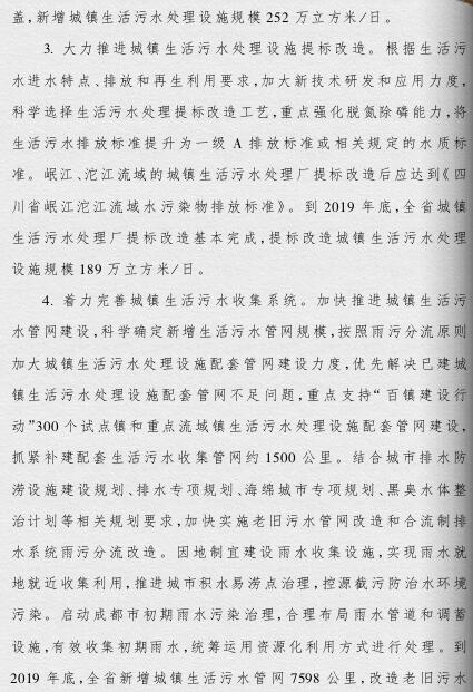 四川省政府印發(fā)了《四川省城鎮(zhèn)污水處理設施建設三年推進方案》?!斗桨浮诽岢?,今年成都市建成區(qū)要全部消除黑臭水體,到2019年,全省城鎮(zhèn)基本具備污水收集能力,地級及以上城市建成區(qū)黑臭水體比例控制在10%以內,全面實現(xiàn)城鎮(zhèn)污水處理設施運行規(guī)范化和監(jiān)管信息化,實現(xiàn)超標工業(yè)廢水零排放,70%的行政村生活污水得到有效處理。