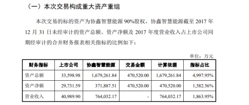 霞客環(huán)保11月5日晚間披露重大資產(chǎn)重組預(yù)案,公司擬通過(guò)重大資產(chǎn)置換及發(fā)行股份購(gòu)買資產(chǎn)的方式,購(gòu)買協(xié)鑫智慧能源90%股份。其中,公司擬置出資產(chǎn)作價(jià)2.69億元,協(xié)鑫智慧能源90%股份作價(jià)47.05億元,二者差額部分由公司發(fā)行股份購(gòu)買,此次交易構(gòu)成重組上市。