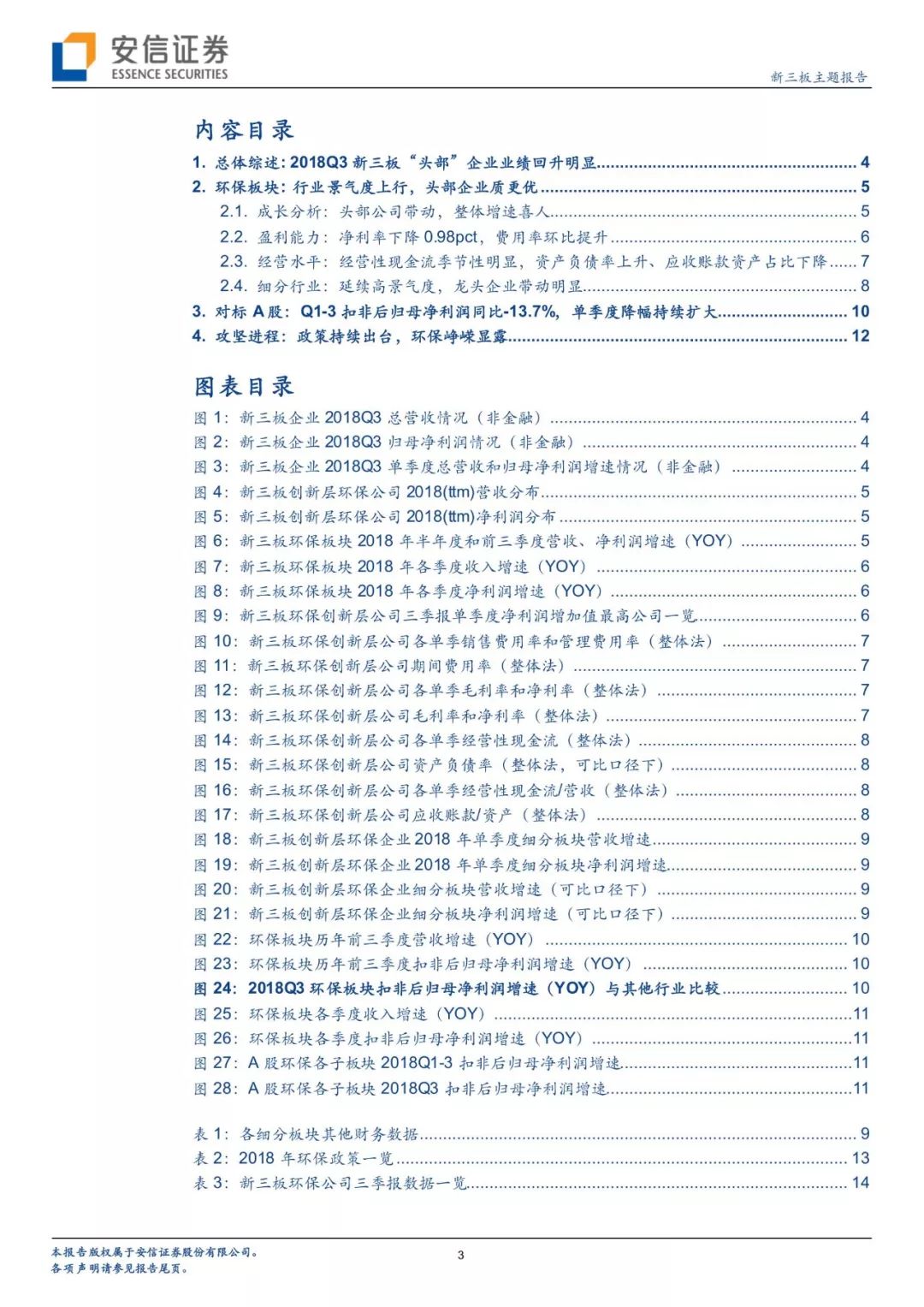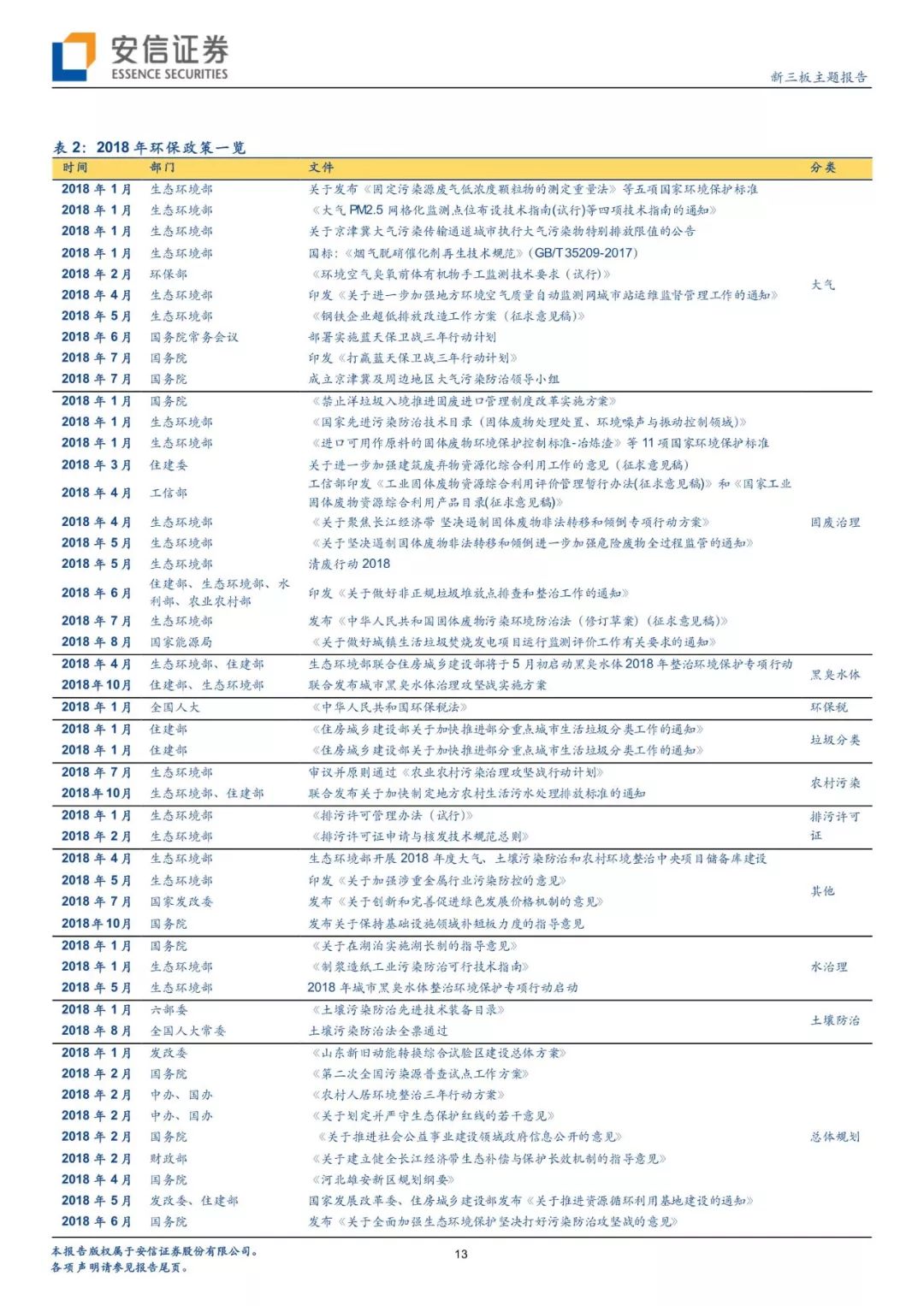 從政策進展看環(huán)境變遷路徑,環(huán)境治理已經(jīng)實現(xiàn)圍繞大氣+水+土壤三大維度建立起“環(huán)保稅+排污許可證”兩大保障、從城市走向農(nóng)村的一體化大環(huán)保格局。自年初環(huán)保稅、排污許可證實施以來,政策力度不減且頻頻出臺,在肯定我國環(huán)境治理已取得階段性的勝利的同時,進行大氣、水、固廢、土壤等細分領域的深化推進。我們對于2018年以來各細分板塊政策及變遷進行了梳理。而新三板擁有400家公司,覆蓋了大氣治理、水治理、固廢治理等各個領域。我們繼續(xù)看好環(huán)保板塊,建議從政策推進進程中發(fā)掘潛在機會,建議關注水治理、固廢治理和再生資源板塊投資機會。