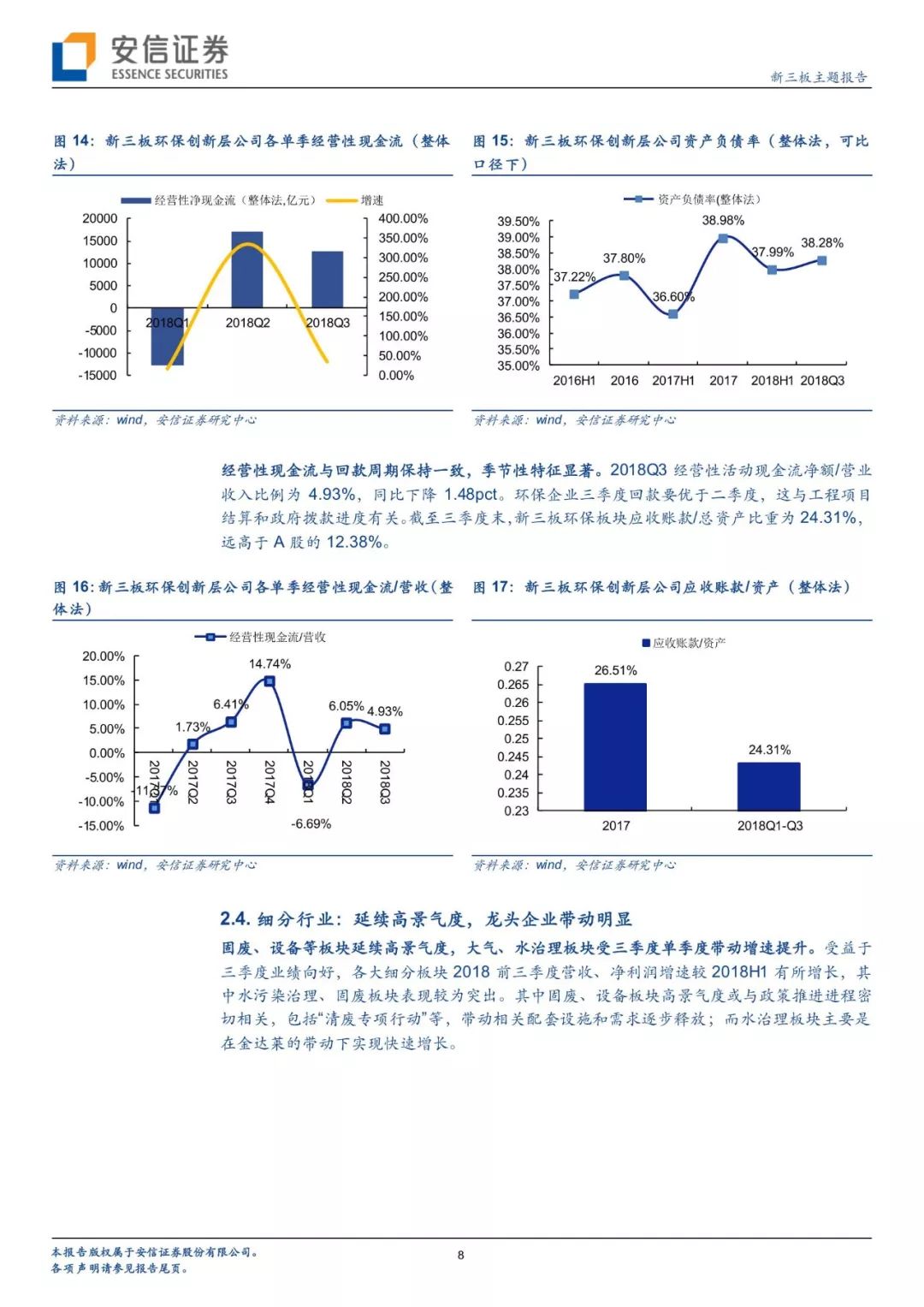 經(jīng)營水平:截至2018年三季度末,新三板創(chuàng)新層環(huán)保板塊資產(chǎn)負債率為38.28%,遠低于A股環(huán)保板塊的56.85%,主要原因是A股環(huán)保企業(yè)依托PPP模式,且2014年-2017年的大力推廣期,資產(chǎn)負債率呈現(xiàn)明顯上升,進入加杠桿周期,而PPP項目對于新三板環(huán)保板塊影響較小。經(jīng)營性現(xiàn)金流與回款周期保持一致,季節(jié)性特征顯著。2018Q3經(jīng)營性活動現(xiàn)金流凈額/營業(yè)收入比例為4.93%,同比下降1.48pct。環(huán)保企業(yè)三季度回款要優(yōu)于二季度,這與工程項目結算和政府撥款進度有關。截至三季度末,新三板環(huán)保板塊應收賬款/總資產(chǎn)比重為24.31%,遠高于A股的12.38%,主要與新三板環(huán)保企業(yè)議價能力有關。